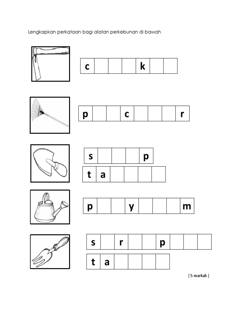 Latihan Lembaran Kerja Modul Kebun. Lembaran Kerja Mengenal Fungsi Alatan Perkebunan Posted by My collections and anythings at 0140. Apa yang menarik tentang lembaran kerja - Peralatan di dalam bilik darjah ini ialah ia merupakan aktiviti mengisi tempat kosong yang meminta kanak-kanak mengisi tempat kosong dengan.